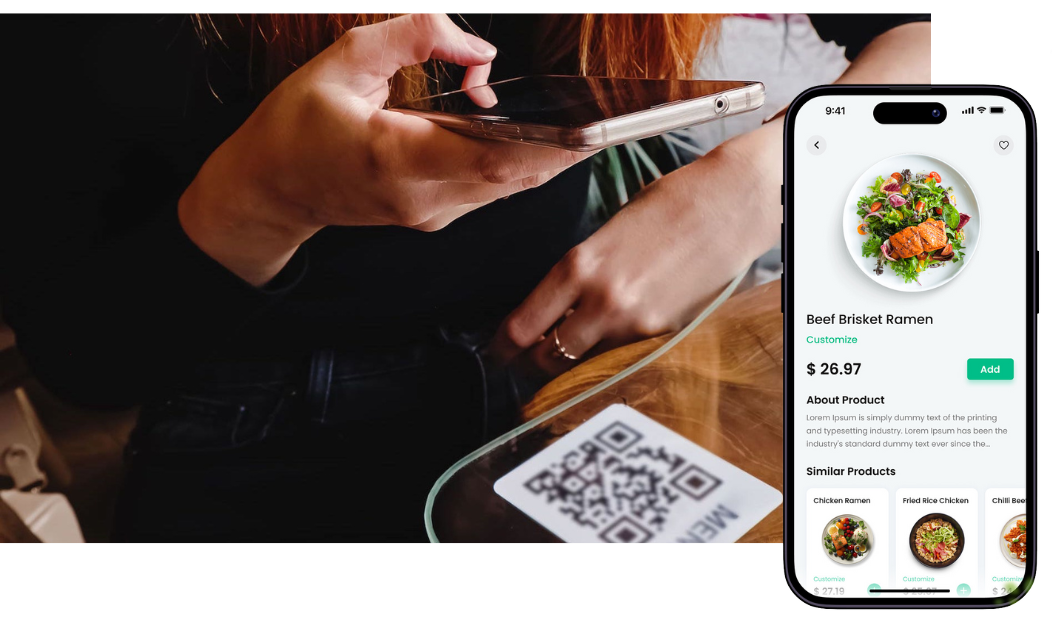 Let customers order and pay right from their table to give limited service staff more hands, enhance safety, and boost average order values. No hardware required: customers order from their own phone via QR codes in store.